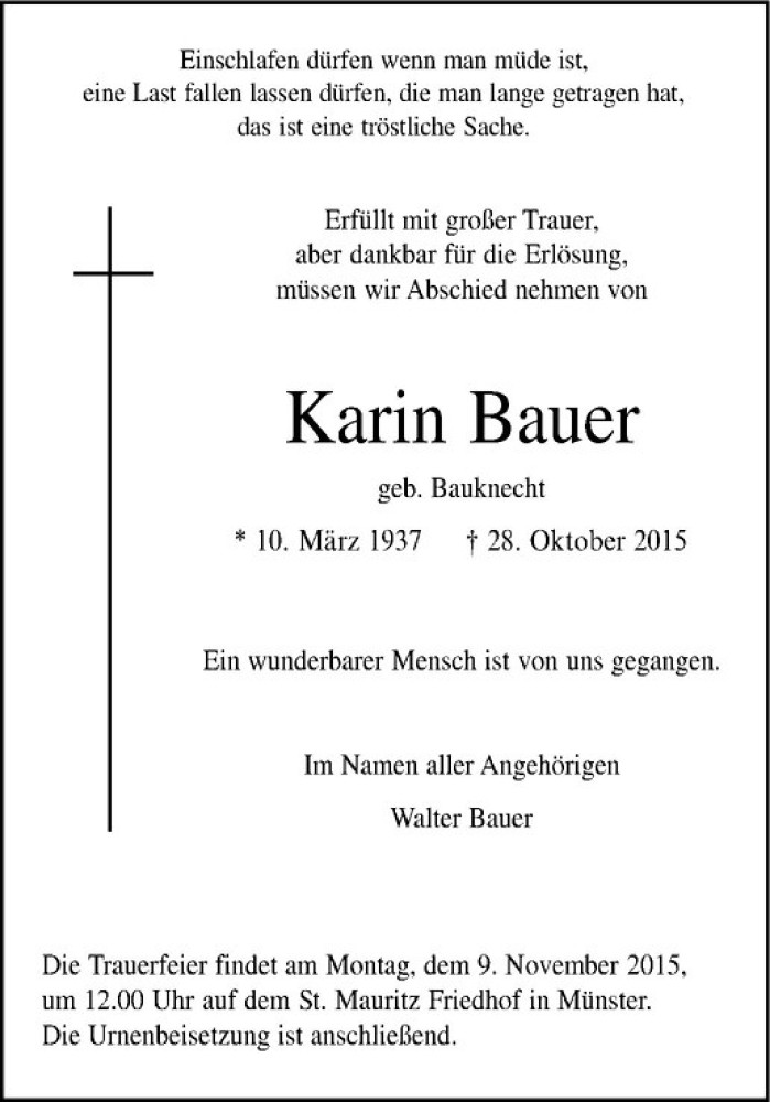 Hier finden Sie alle Traueranzeigen aus der Zeitung, die bisher für Karin Bauer erschienen sind. Weitere Traueranzeigen, die in der Zeitung erscheinen, werden hier ebenfalls aufgelistet