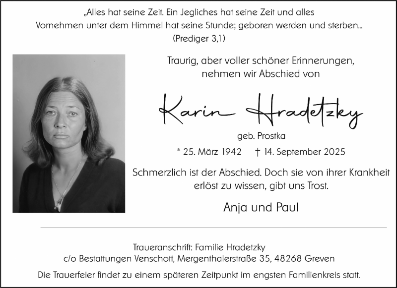 Hier finden Sie alle Traueranzeigen aus der Zeitung, die bisher für Karin Hradetzky erschienen sind. Weitere Traueranzeigen, die in der Zeitung erscheinen, werden hier ebenfalls aufgelistet