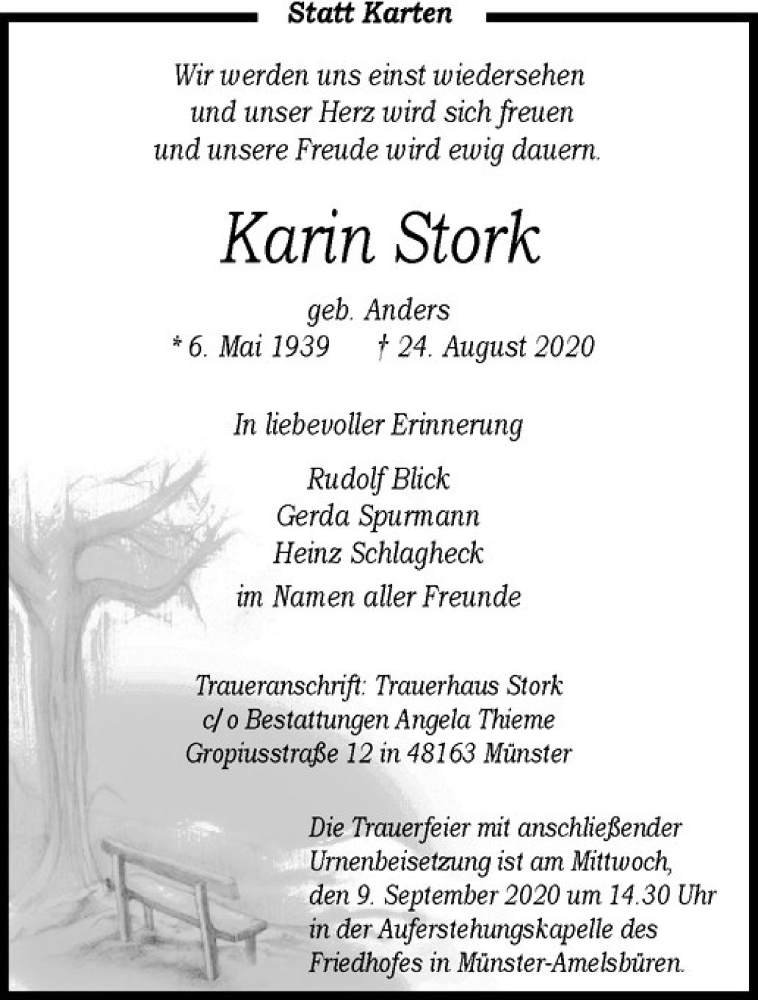 Hier finden Sie alle Traueranzeigen aus der Zeitung, die bisher für Karin Stork erschienen sind. Weitere Traueranzeigen, die in der Zeitung erscheinen, werden hier ebenfalls aufgelistet