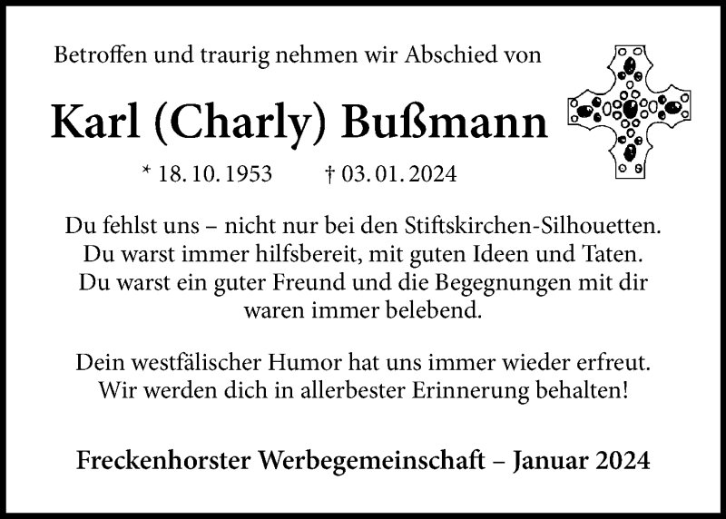 Hier finden Sie alle Traueranzeigen aus der Zeitung, die bisher für Karl Bußmann erschienen sind. Weitere Traueranzeigen, die in der Zeitung erscheinen, werden hier ebenfalls aufgelistet