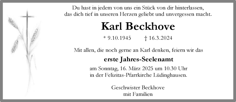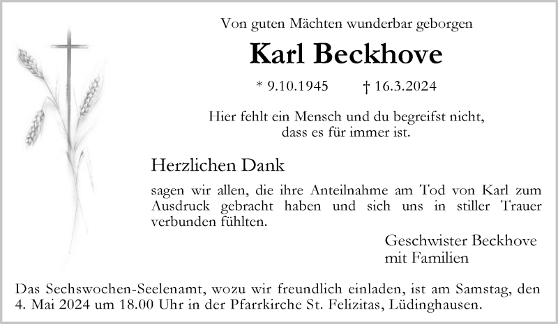 Hier finden Sie alle Traueranzeigen aus der Zeitung, die bisher für Karl Beckhove erschienen sind. Weitere Traueranzeigen, die in der Zeitung erscheinen, werden hier ebenfalls aufgelistet