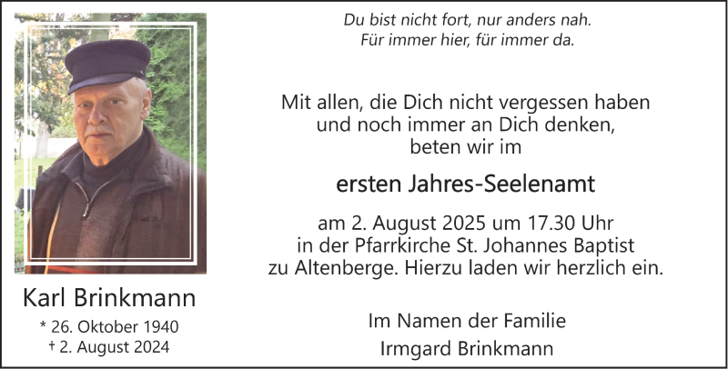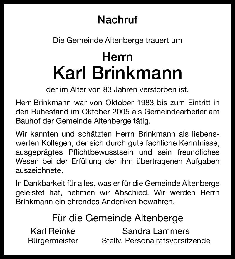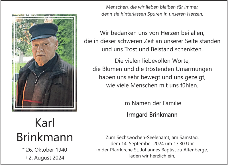 Hier finden Sie alle Traueranzeigen aus der Zeitung, die bisher für Karl Brinkmann erschienen sind. Weitere Traueranzeigen, die in der Zeitung erscheinen, werden hier ebenfalls aufgelistet