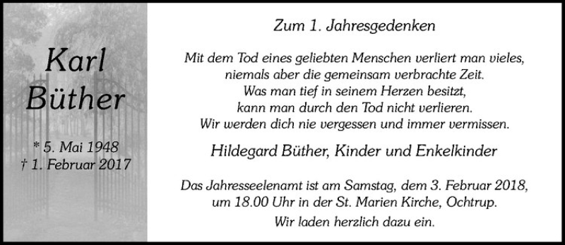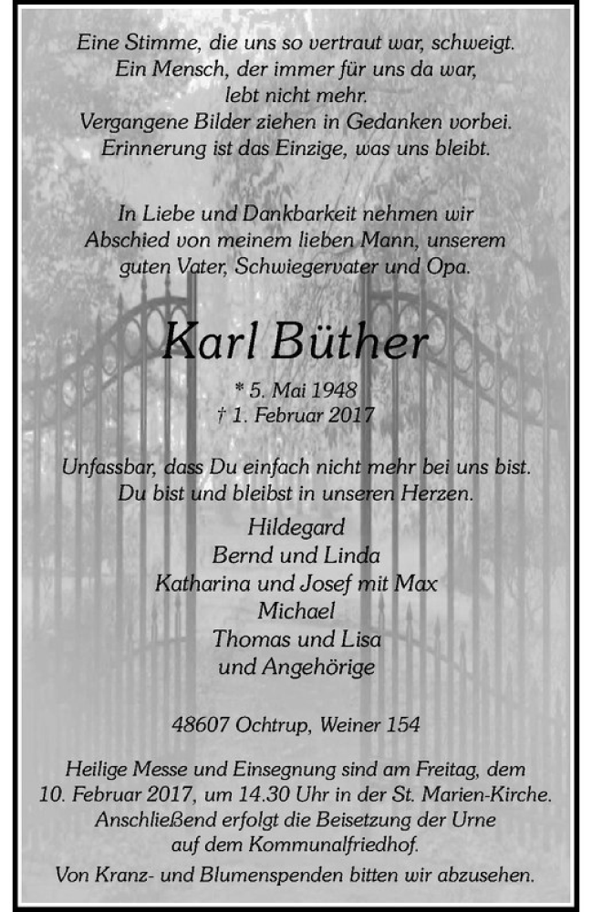 Hier finden Sie alle Traueranzeigen aus der Zeitung, die bisher für Karl Büther erschienen sind. Weitere Traueranzeigen, die in der Zeitung erscheinen, werden hier ebenfalls aufgelistet