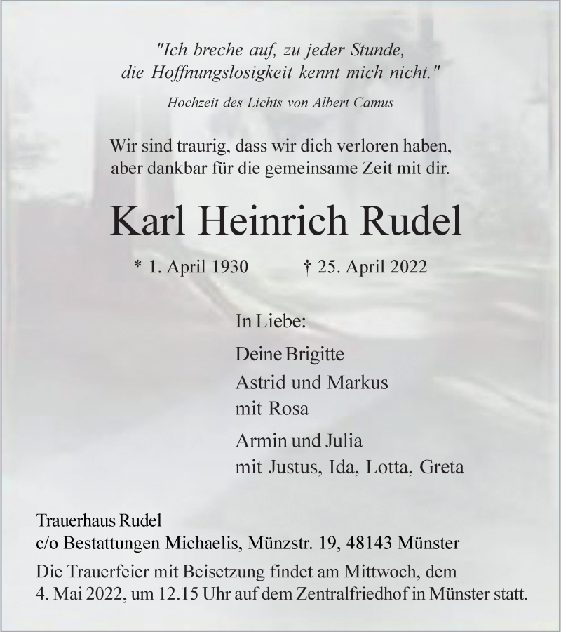 Hier finden Sie alle Traueranzeigen aus der Zeitung, die bisher für Karl Heinrich Rudel erschienen sind. Weitere Traueranzeigen, die in der Zeitung erscheinen, werden hier ebenfalls aufgelistet
