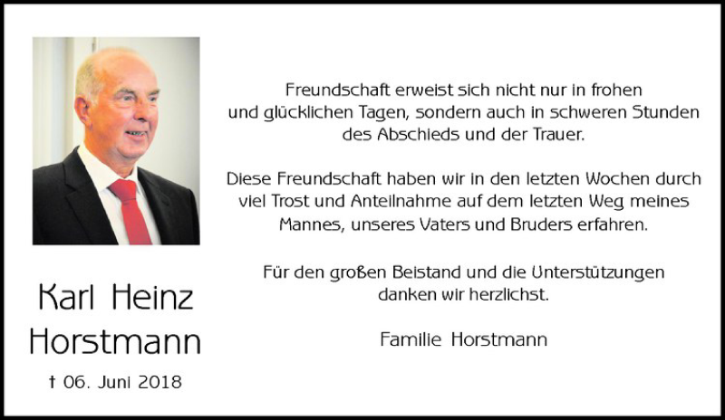 Hier finden Sie alle Traueranzeigen aus der Zeitung, die bisher für Karl Heinz Horstmann erschienen sind. Weitere Traueranzeigen, die in der Zeitung erscheinen, werden hier ebenfalls aufgelistet