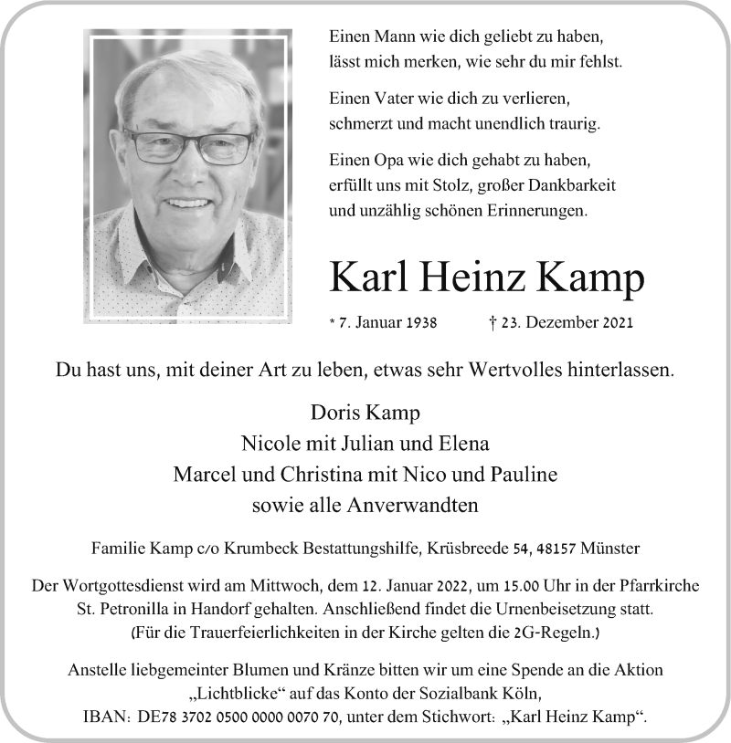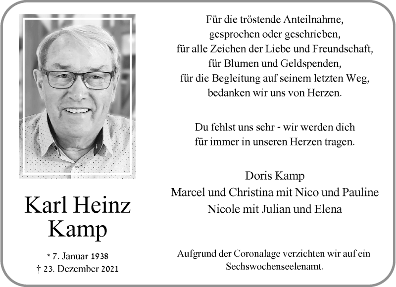 Hier finden Sie alle Traueranzeigen aus der Zeitung, die bisher für Karl Heinz Kamp erschienen sind. Weitere Traueranzeigen, die in der Zeitung erscheinen, werden hier ebenfalls aufgelistet