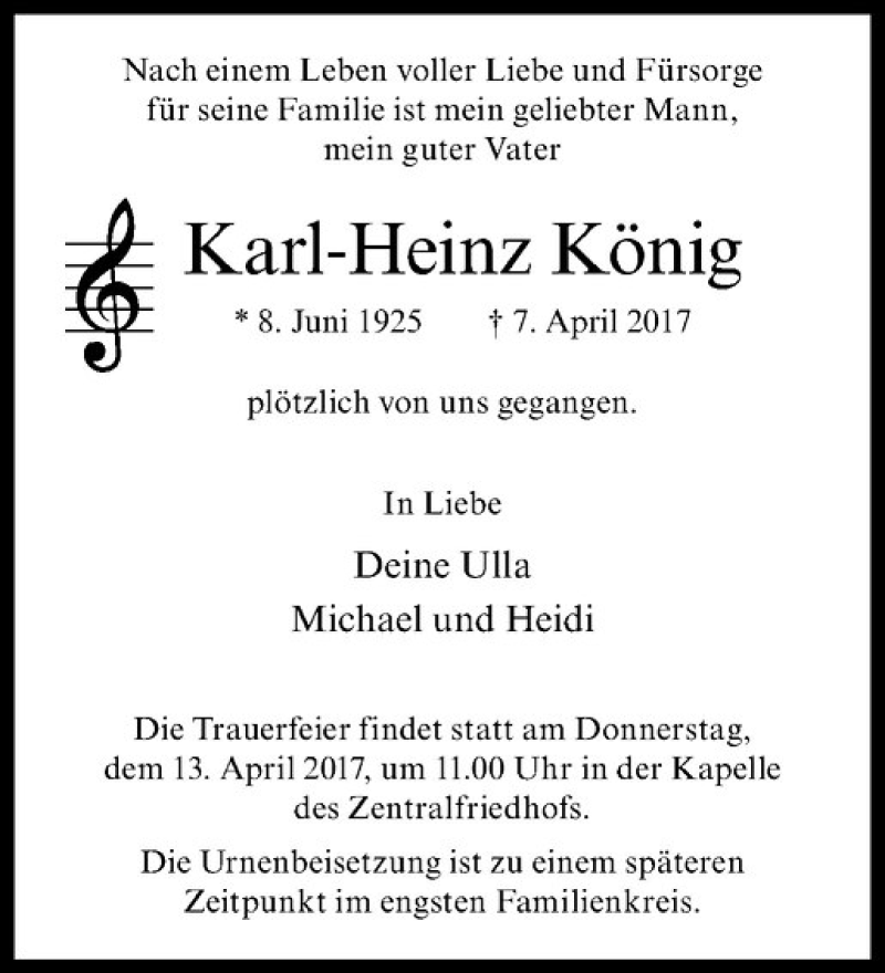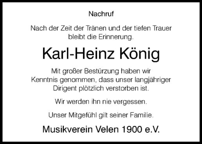 Hier finden Sie alle Traueranzeigen aus der Zeitung, die bisher für Karl-Heinz König erschienen sind. Weitere Traueranzeigen, die in der Zeitung erscheinen, werden hier ebenfalls aufgelistet