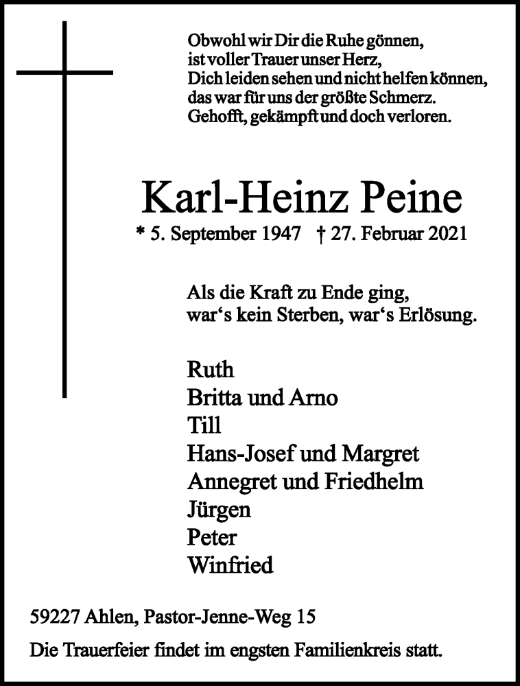 Hier finden Sie alle Traueranzeigen aus der Zeitung, die bisher für Karl-Heinz Peine erschienen sind. Weitere Traueranzeigen, die in der Zeitung erscheinen, werden hier ebenfalls aufgelistet