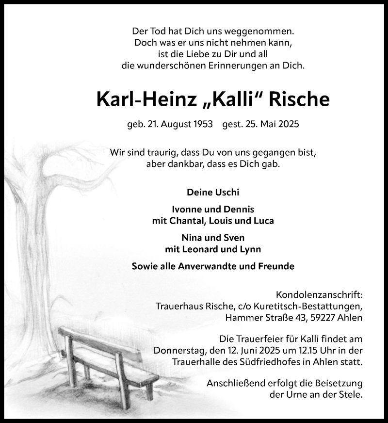 Hier finden Sie alle Traueranzeigen aus der Zeitung, die bisher für Karl-Heinz Rische erschienen sind. Weitere Traueranzeigen, die in der Zeitung erscheinen, werden hier ebenfalls aufgelistet
