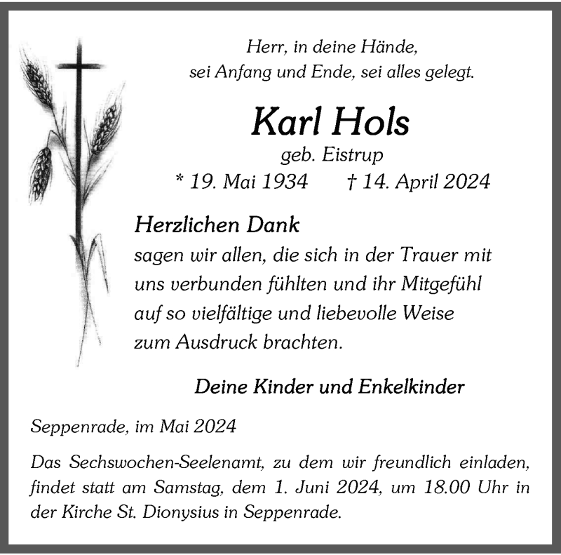 Hier finden Sie alle Traueranzeigen aus der Zeitung, die bisher für Karl Hols erschienen sind. Weitere Traueranzeigen, die in der Zeitung erscheinen, werden hier ebenfalls aufgelistet