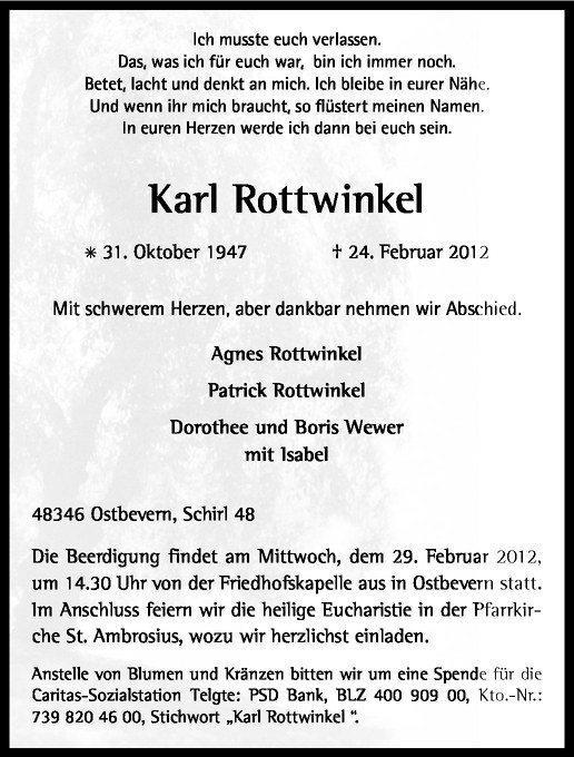 Hier finden Sie alle Traueranzeigen aus der Zeitung, die bisher für Karl Rottwinkel erschienen sind. Weitere Traueranzeigen, die in der Zeitung erscheinen, werden hier ebenfalls aufgelistet