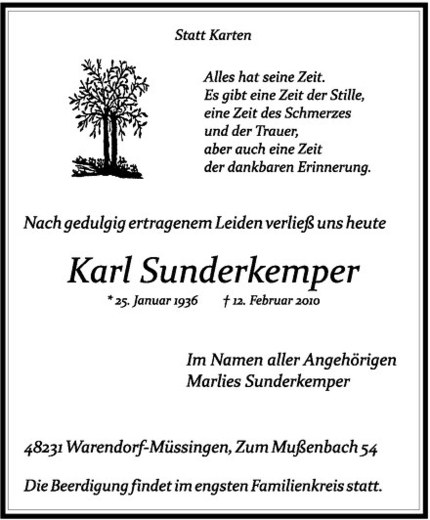 Hier finden Sie alle Traueranzeigen aus der Zeitung, die bisher für Karl Sunderkemper erschienen sind. Weitere Traueranzeigen, die in der Zeitung erscheinen, werden hier ebenfalls aufgelistet