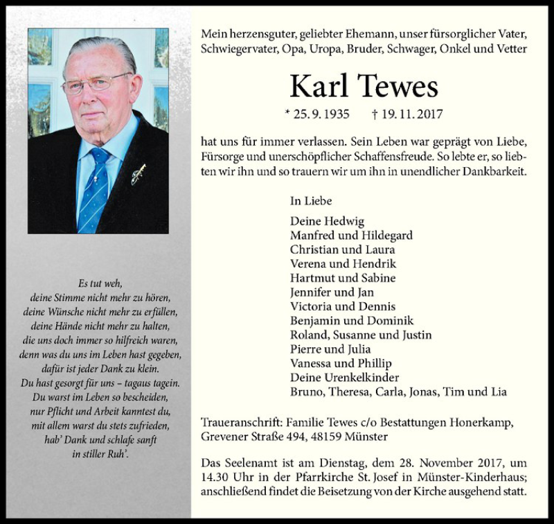 Hier finden Sie alle Traueranzeigen aus der Zeitung, die bisher für Karl Tewes erschienen sind. Weitere Traueranzeigen, die in der Zeitung erscheinen, werden hier ebenfalls aufgelistet