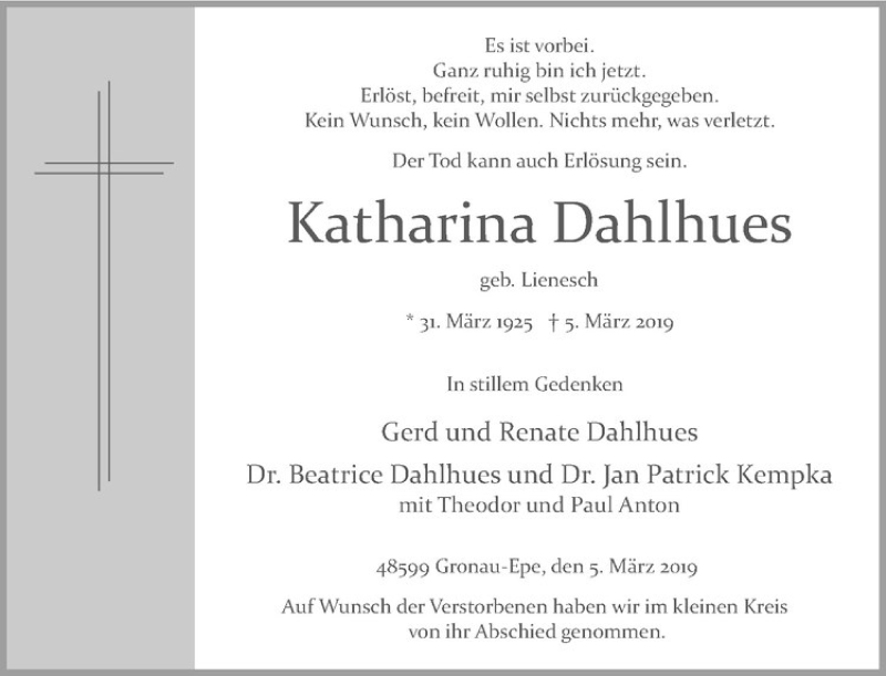 Hier finden Sie alle Traueranzeigen aus der Zeitung, die bisher für Katharina Dahlhues erschienen sind. Weitere Traueranzeigen, die in der Zeitung erscheinen, werden hier ebenfalls aufgelistet