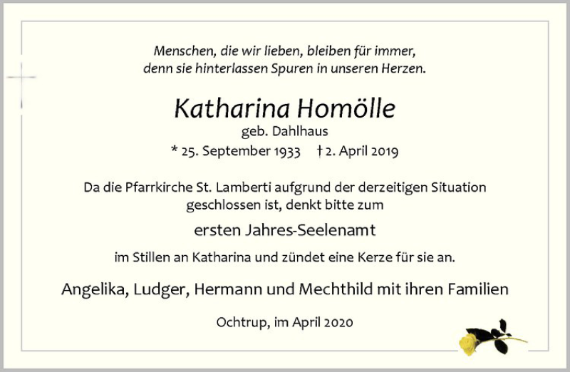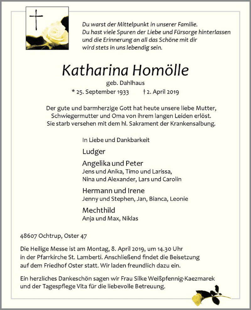 Hier finden Sie alle Traueranzeigen aus der Zeitung, die bisher für Katharina Homölle erschienen sind. Weitere Traueranzeigen, die in der Zeitung erscheinen, werden hier ebenfalls aufgelistet