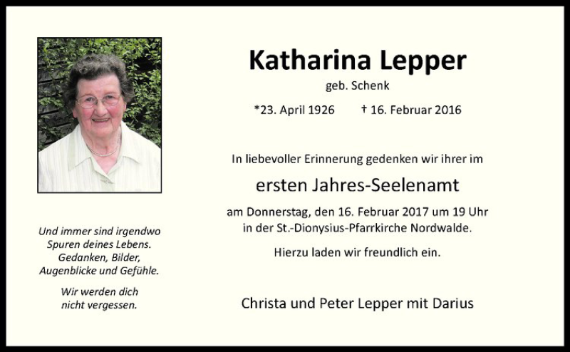 Hier finden Sie alle Traueranzeigen aus der Zeitung, die bisher für Katharina Lepper erschienen sind. Weitere Traueranzeigen, die in der Zeitung erscheinen, werden hier ebenfalls aufgelistet