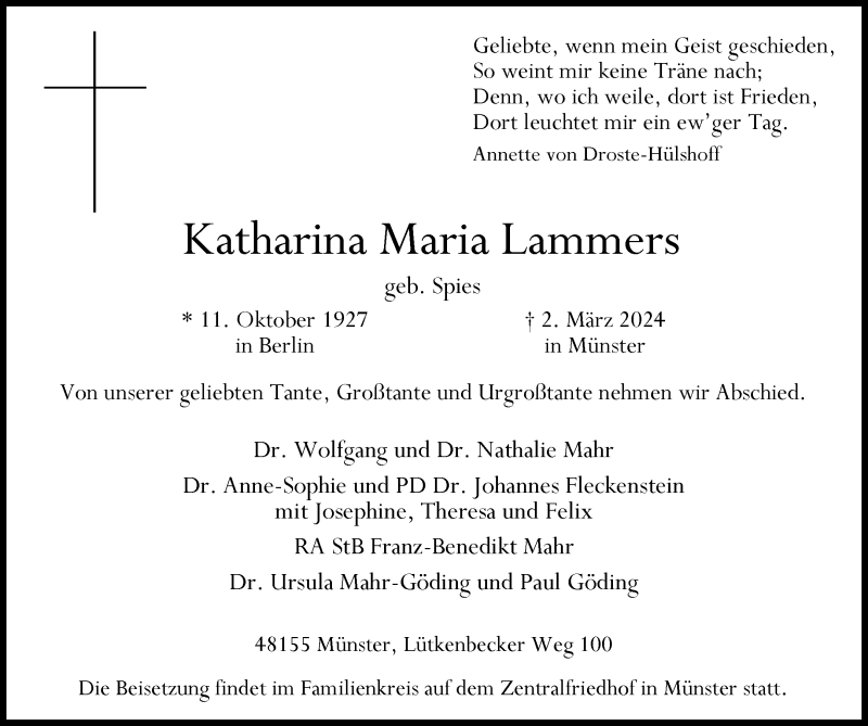 Hier finden Sie alle Traueranzeigen aus der Zeitung, die bisher für Katharina Maria Lammers erschienen sind. Weitere Traueranzeigen, die in der Zeitung erscheinen, werden hier ebenfalls aufgelistet
