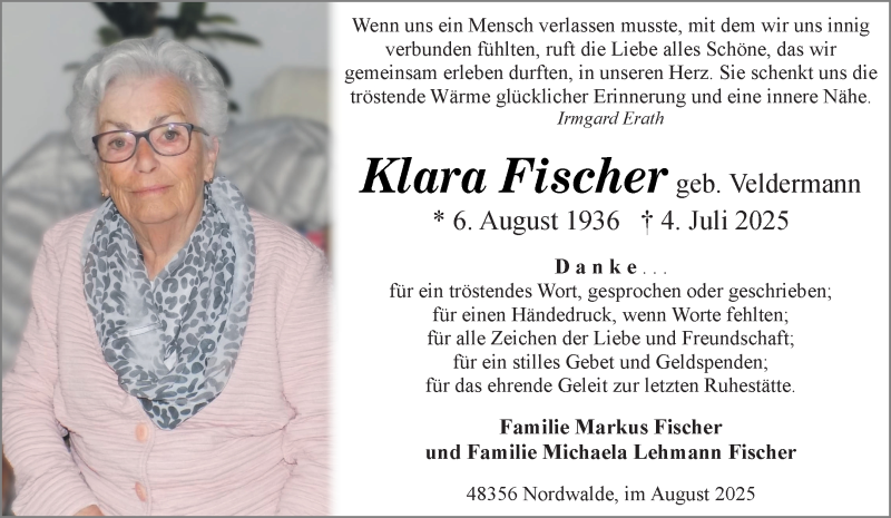 Hier finden Sie alle Traueranzeigen aus der Zeitung, die bisher für Klara Fischer erschienen sind. Weitere Traueranzeigen, die in der Zeitung erscheinen, werden hier ebenfalls aufgelistet