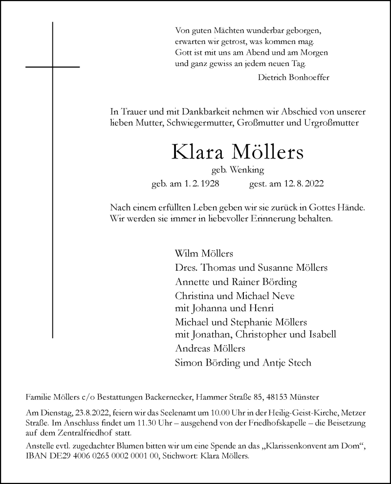 Hier finden Sie alle Traueranzeigen aus der Zeitung, die bisher für Klara Möllers erschienen sind. Weitere Traueranzeigen, die in der Zeitung erscheinen, werden hier ebenfalls aufgelistet