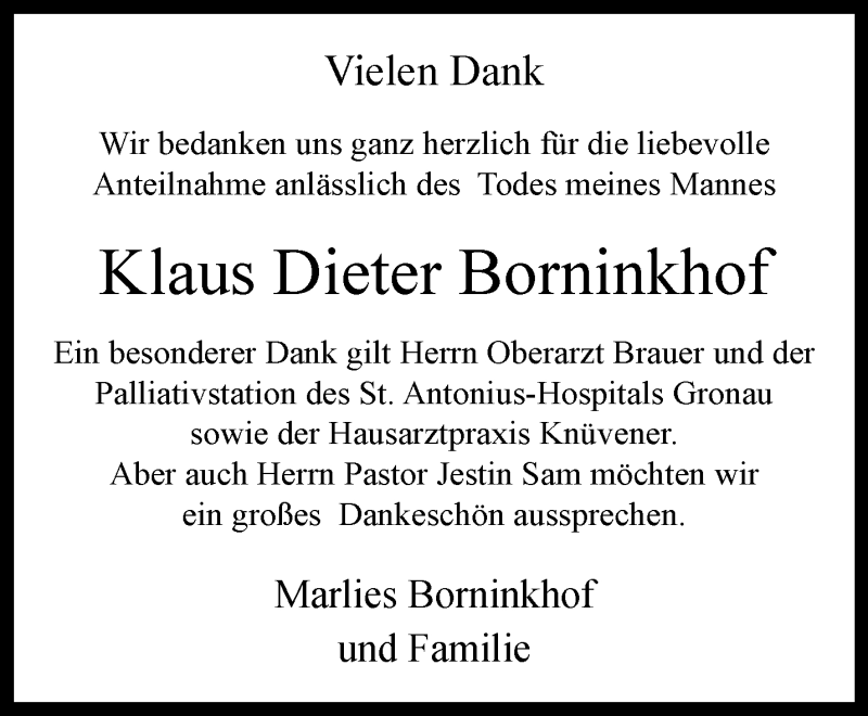 Hier finden Sie alle Traueranzeigen aus der Zeitung, die bisher für Klaus Dieter Borninkhof erschienen sind. Weitere Traueranzeigen, die in der Zeitung erscheinen, werden hier ebenfalls aufgelistet