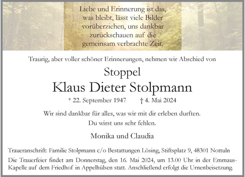 Hier finden Sie alle Traueranzeigen aus der Zeitung, die bisher für Klaus Dieter Stolpmann erschienen sind. Weitere Traueranzeigen, die in der Zeitung erscheinen, werden hier ebenfalls aufgelistet