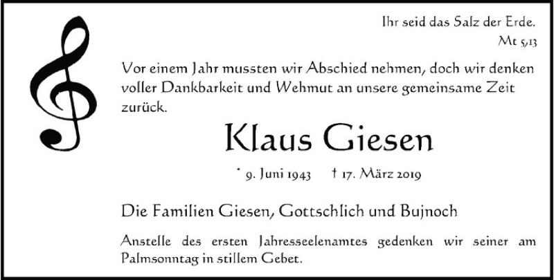 Hier finden Sie alle Traueranzeigen aus der Zeitung, die bisher für Klaus Giesen erschienen sind. Weitere Traueranzeigen, die in der Zeitung erscheinen, werden hier ebenfalls aufgelistet