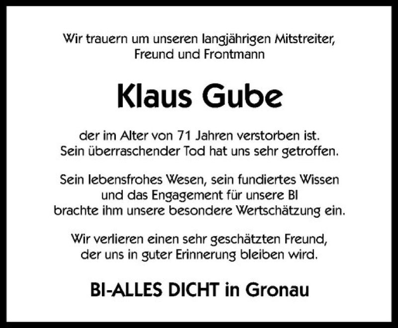 Hier finden Sie alle Traueranzeigen aus der Zeitung, die bisher für Klaus Gube erschienen sind. Weitere Traueranzeigen, die in der Zeitung erscheinen, werden hier ebenfalls aufgelistet