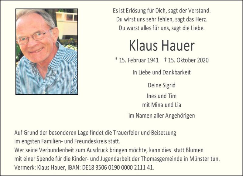 Hier finden Sie alle Traueranzeigen aus der Zeitung, die bisher für Klaus Hauer erschienen sind. Weitere Traueranzeigen, die in der Zeitung erscheinen, werden hier ebenfalls aufgelistet