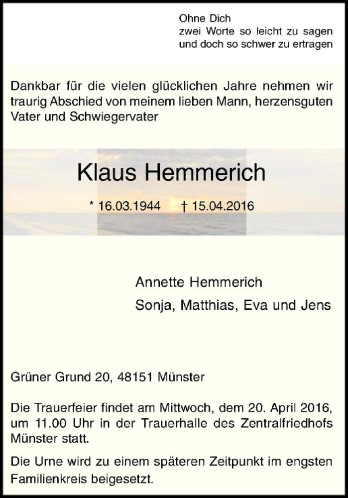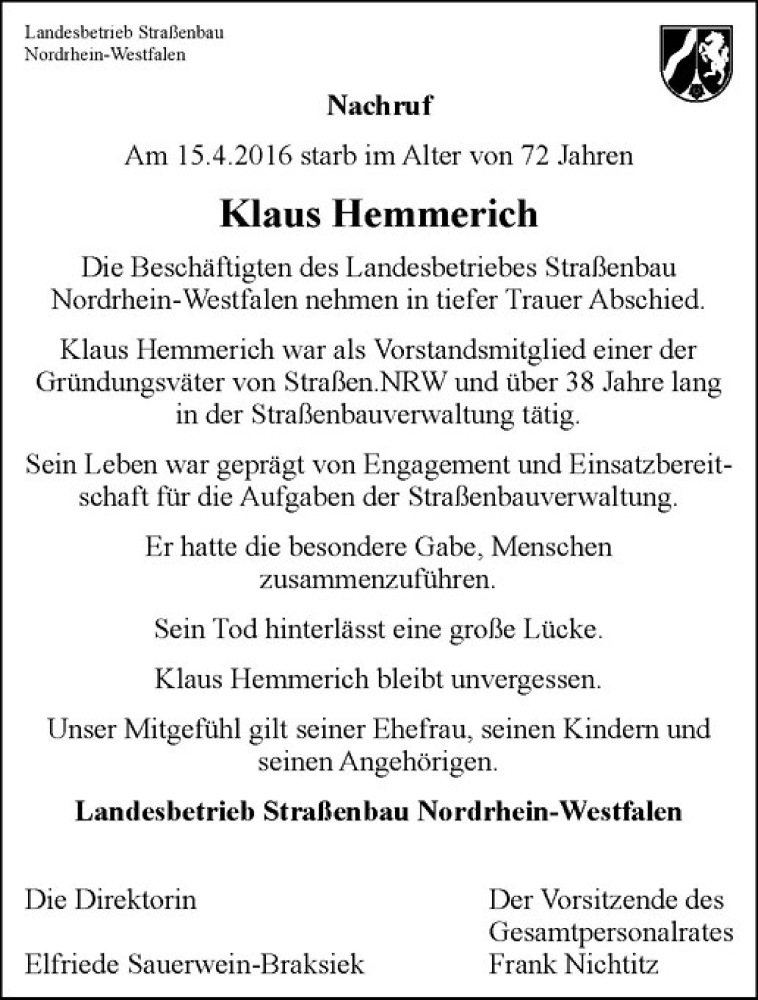Hier finden Sie alle Traueranzeigen aus der Zeitung, die bisher für Klaus Hemmerich erschienen sind. Weitere Traueranzeigen, die in der Zeitung erscheinen, werden hier ebenfalls aufgelistet