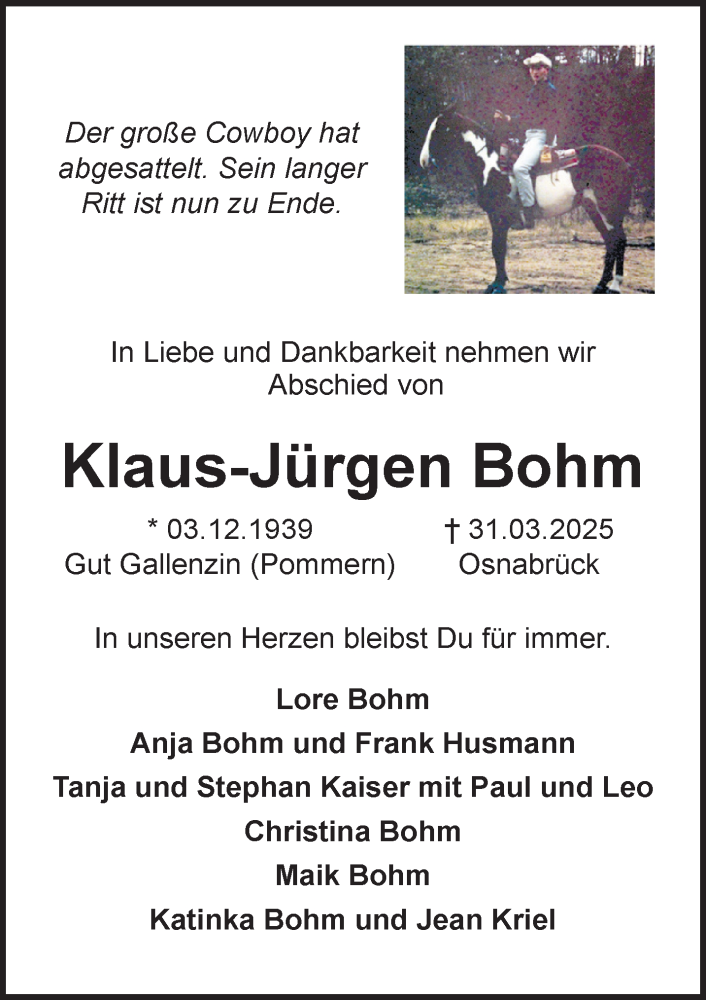 Hier finden Sie alle Traueranzeigen aus der Zeitung, die bisher für Klaus-Jürgen Bohm erschienen sind. Weitere Traueranzeigen, die in der Zeitung erscheinen, werden hier ebenfalls aufgelistet