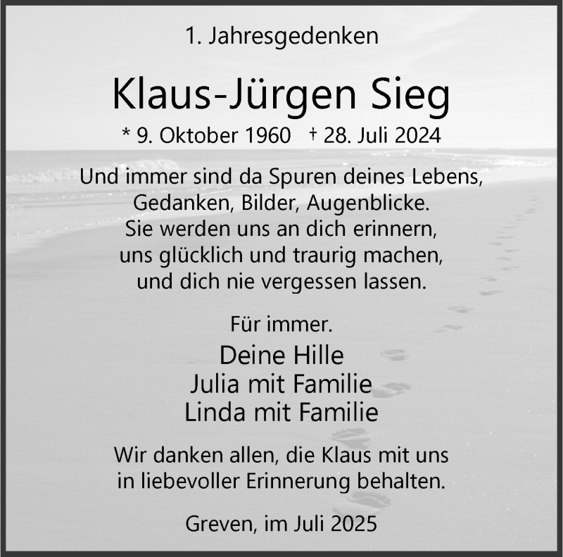 Hier finden Sie alle Traueranzeigen aus der Zeitung, die bisher für Klaus-Jürgen Sieg erschienen sind. Weitere Traueranzeigen, die in der Zeitung erscheinen, werden hier ebenfalls aufgelistet