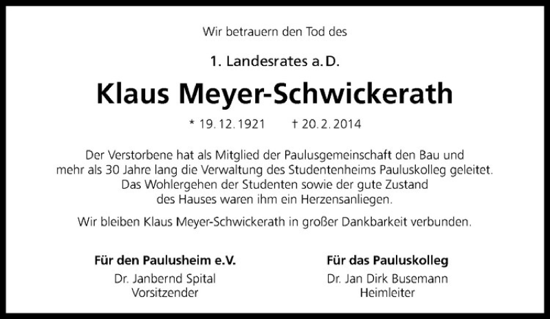 Hier finden Sie alle Traueranzeigen aus der Zeitung, die bisher für Klaus Meyer-Schwickerath erschienen sind. Weitere Traueranzeigen, die in der Zeitung erscheinen, werden hier ebenfalls aufgelistet