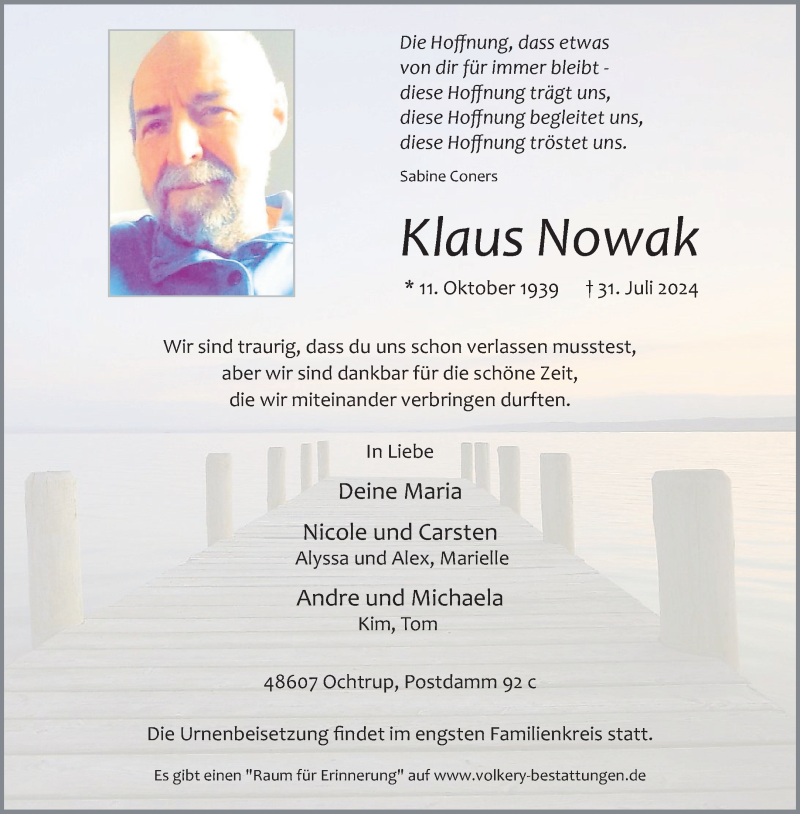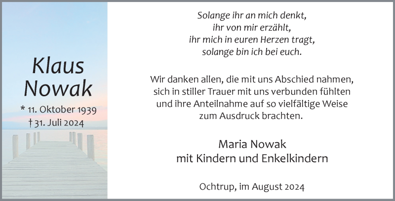 Hier finden Sie alle Traueranzeigen aus der Zeitung, die bisher für Klaus Nowak erschienen sind. Weitere Traueranzeigen, die in der Zeitung erscheinen, werden hier ebenfalls aufgelistet