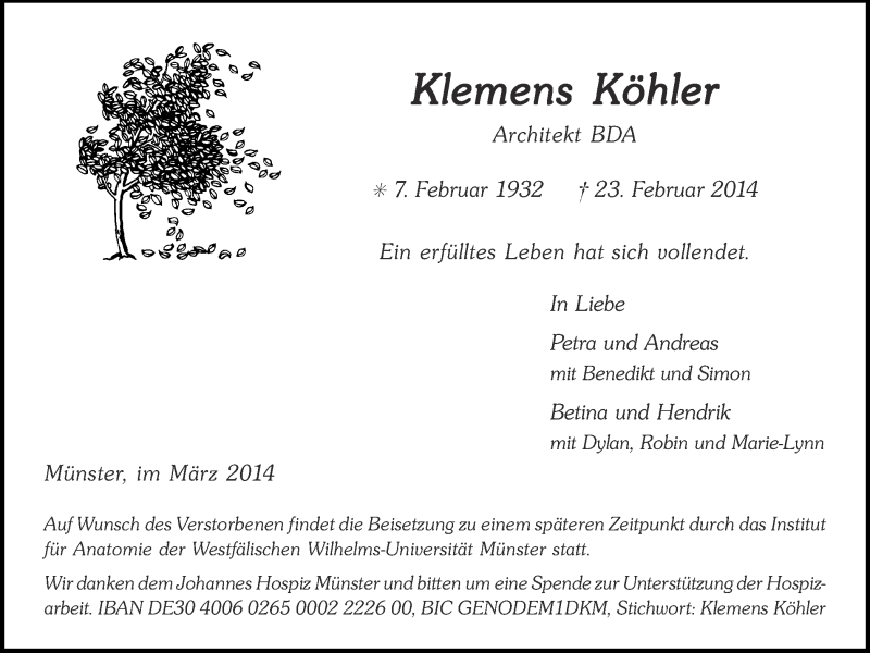 Hier finden Sie alle Traueranzeigen aus der Zeitung, die bisher für Klemens Köhler erschienen sind. Weitere Traueranzeigen, die in der Zeitung erscheinen, werden hier ebenfalls aufgelistet