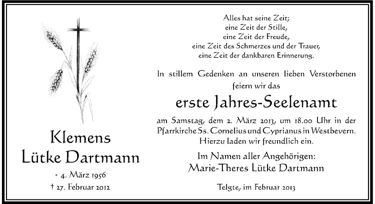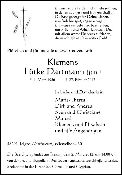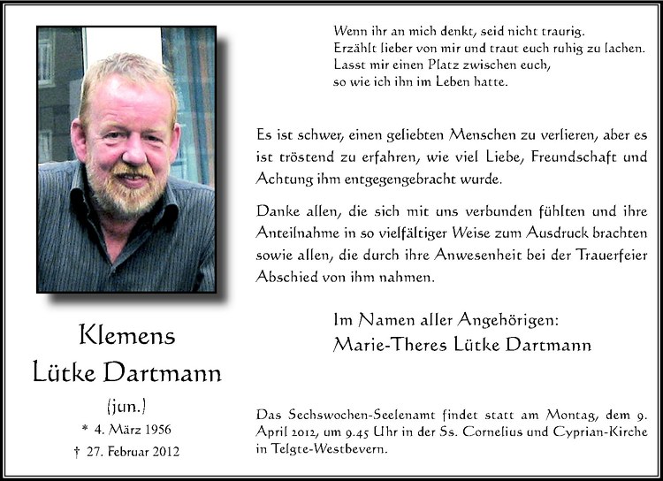 Hier finden Sie alle Traueranzeigen aus der Zeitung, die bisher für Klemens Lütke Dartmann erschienen sind. Weitere Traueranzeigen, die in der Zeitung erscheinen, werden hier ebenfalls aufgelistet