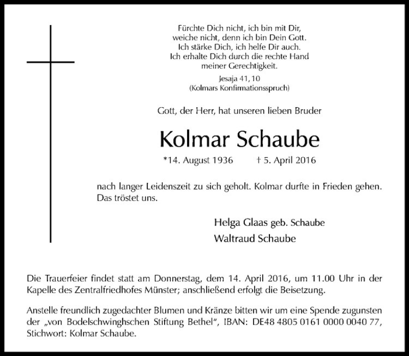 Hier finden Sie alle Traueranzeigen aus der Zeitung, die bisher für Kolmar Schaube erschienen sind. Weitere Traueranzeigen, die in der Zeitung erscheinen, werden hier ebenfalls aufgelistet