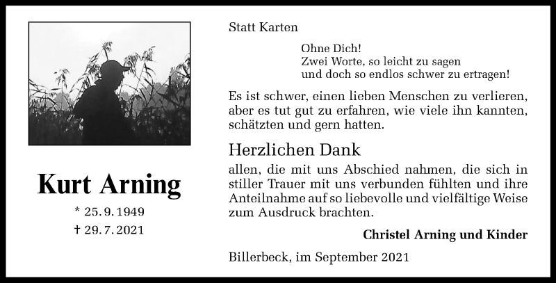 Hier finden Sie alle Traueranzeigen aus der Zeitung, die bisher für Kurt Arning erschienen sind. Weitere Traueranzeigen, die in der Zeitung erscheinen, werden hier ebenfalls aufgelistet
