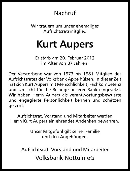 Hier finden Sie alle Traueranzeigen aus der Zeitung, die bisher für Kurt Aupers erschienen sind. Weitere Traueranzeigen, die in der Zeitung erscheinen, werden hier ebenfalls aufgelistet