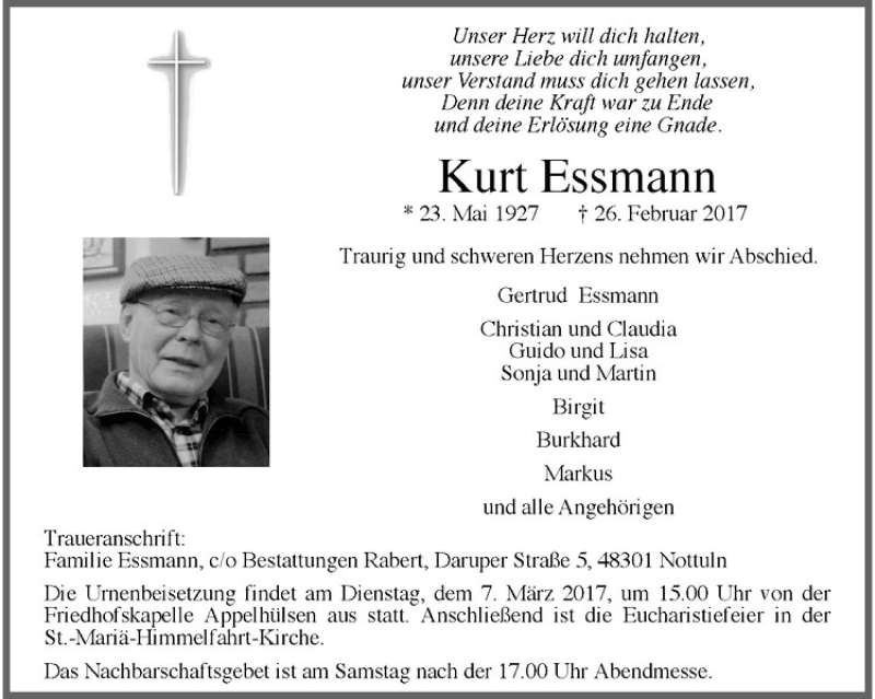 Hier finden Sie alle Traueranzeigen aus der Zeitung, die bisher für Kurt Essmann erschienen sind. Weitere Traueranzeigen, die in der Zeitung erscheinen, werden hier ebenfalls aufgelistet