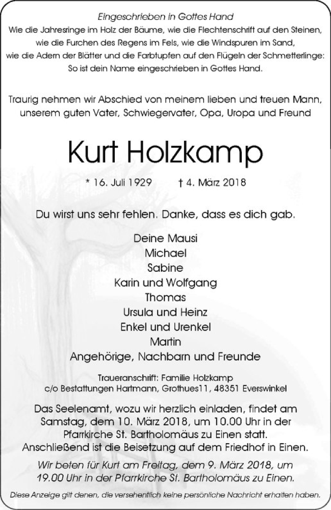 Hier finden Sie alle Traueranzeigen aus der Zeitung, die bisher für Kurt Holzkamp erschienen sind. Weitere Traueranzeigen, die in der Zeitung erscheinen, werden hier ebenfalls aufgelistet