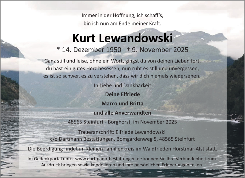 Hier finden Sie alle Traueranzeigen aus der Zeitung, die bisher für Kurt Lewandowski erschienen sind. Weitere Traueranzeigen, die in der Zeitung erscheinen, werden hier ebenfalls aufgelistet