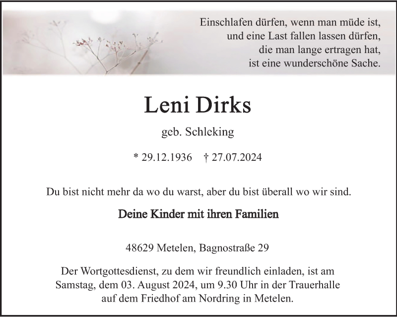 Hier finden Sie alle Traueranzeigen aus der Zeitung, die bisher für Leni Dirks erschienen sind. Weitere Traueranzeigen, die in der Zeitung erscheinen, werden hier ebenfalls aufgelistet
