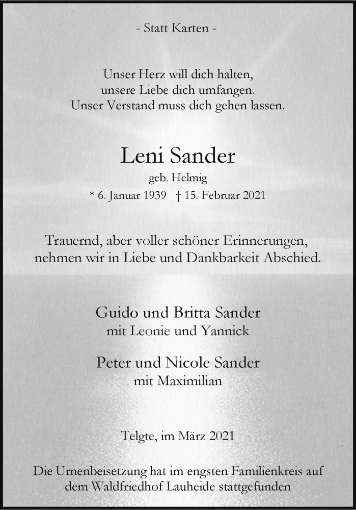Hier finden Sie alle Traueranzeigen aus der Zeitung, die bisher für Leni Sander erschienen sind. Weitere Traueranzeigen, die in der Zeitung erscheinen, werden hier ebenfalls aufgelistet