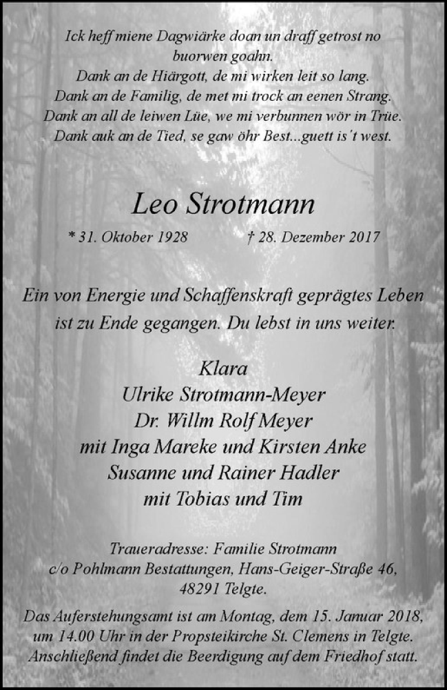 Hier finden Sie alle Traueranzeigen aus der Zeitung, die bisher für Leo Strotmann erschienen sind. Weitere Traueranzeigen, die in der Zeitung erscheinen, werden hier ebenfalls aufgelistet