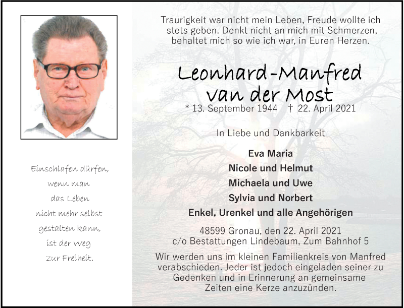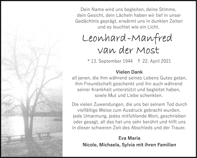 Hier finden Sie alle Traueranzeigen aus der Zeitung, die bisher für Leonhard-Manfred van der Most erschienen sind. Weitere Traueranzeigen, die in der Zeitung erscheinen, werden hier ebenfalls aufgelistet