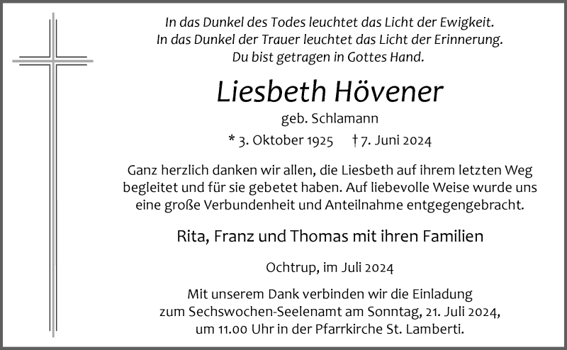 Hier finden Sie alle Traueranzeigen aus der Zeitung, die bisher für Liesbeth Hövener erschienen sind. Weitere Traueranzeigen, die in der Zeitung erscheinen, werden hier ebenfalls aufgelistet