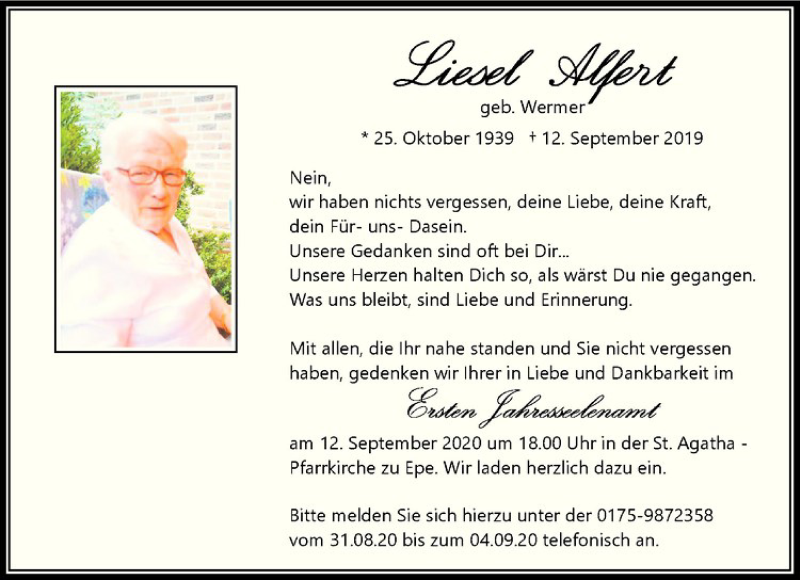 Hier finden Sie alle Traueranzeigen aus der Zeitung, die bisher für Liesel Alfert erschienen sind. Weitere Traueranzeigen, die in der Zeitung erscheinen, werden hier ebenfalls aufgelistet