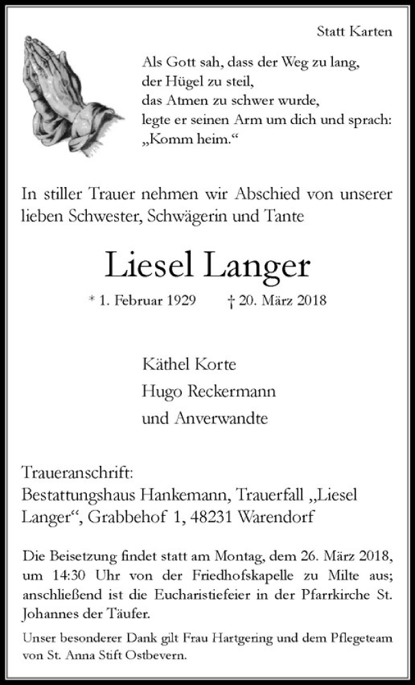 Hier finden Sie alle Traueranzeigen aus der Zeitung, die bisher für Liesel Langer erschienen sind. Weitere Traueranzeigen, die in der Zeitung erscheinen, werden hier ebenfalls aufgelistet