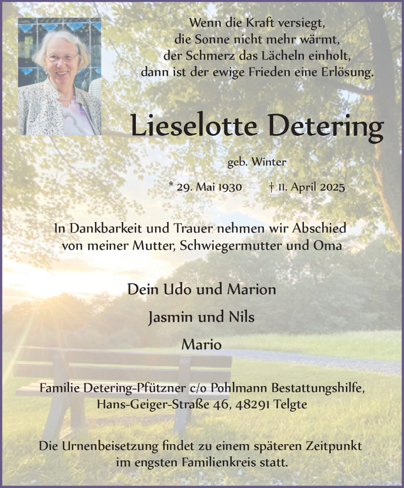Hier finden Sie alle Traueranzeigen aus der Zeitung, die bisher für Lieselotte Detering erschienen sind. Weitere Traueranzeigen, die in der Zeitung erscheinen, werden hier ebenfalls aufgelistet