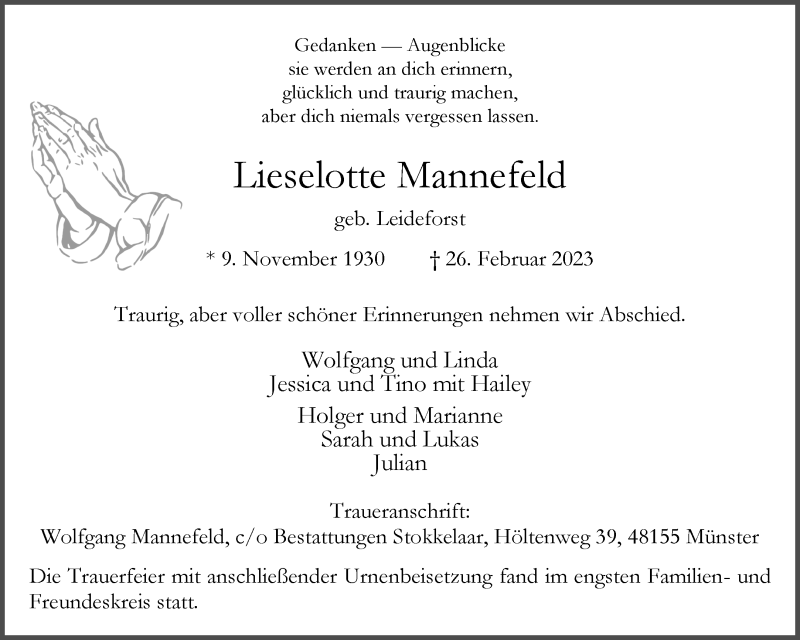 Hier finden Sie alle Traueranzeigen aus der Zeitung, die bisher für Lieselotte Mannefeld-- Augenblicke erschienen sind. Weitere Traueranzeigen, die in der Zeitung erscheinen, werden hier ebenfalls aufgelistet